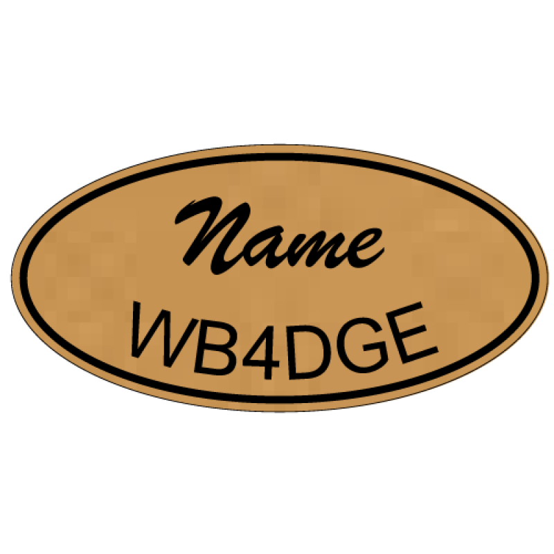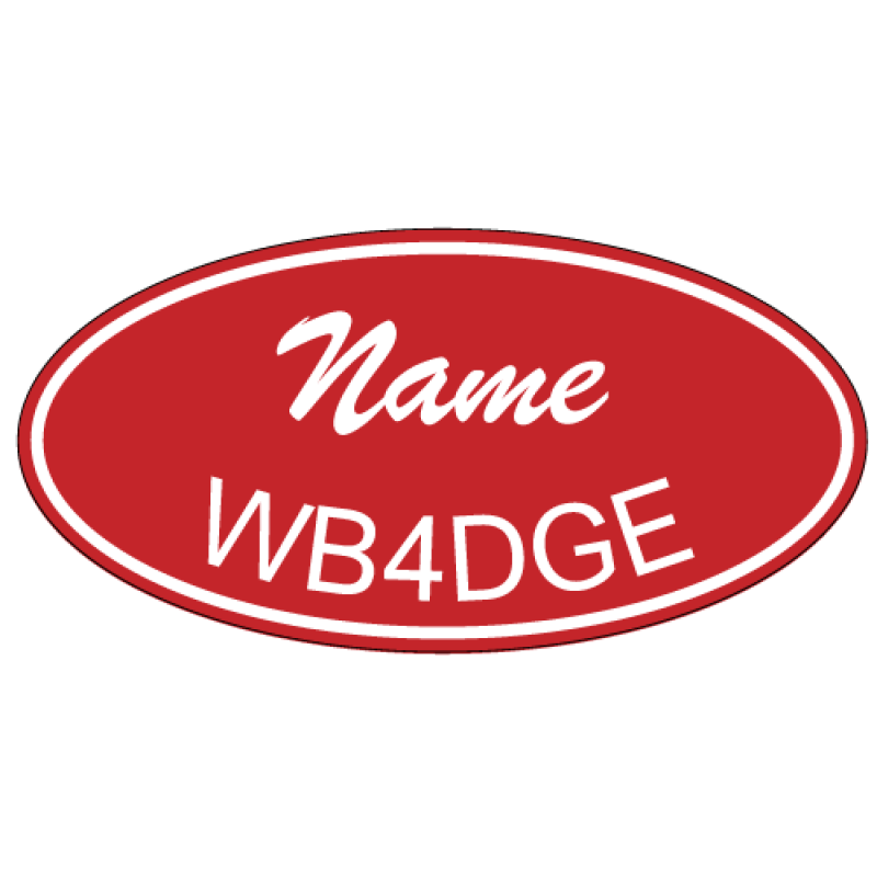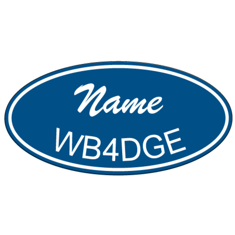 This mediumesque badge is an oval shape of the same 1½" x 3" variety, with a classic cursive script for your first name, followed by a traditional, easy-to-read call sign following along the bottom edge. Both lines of text are surrounded by an exquisitely simple and well-placed three-point line. This amazing badge is sure to make people stop you in the store to ask you to reach something off the top shelf.